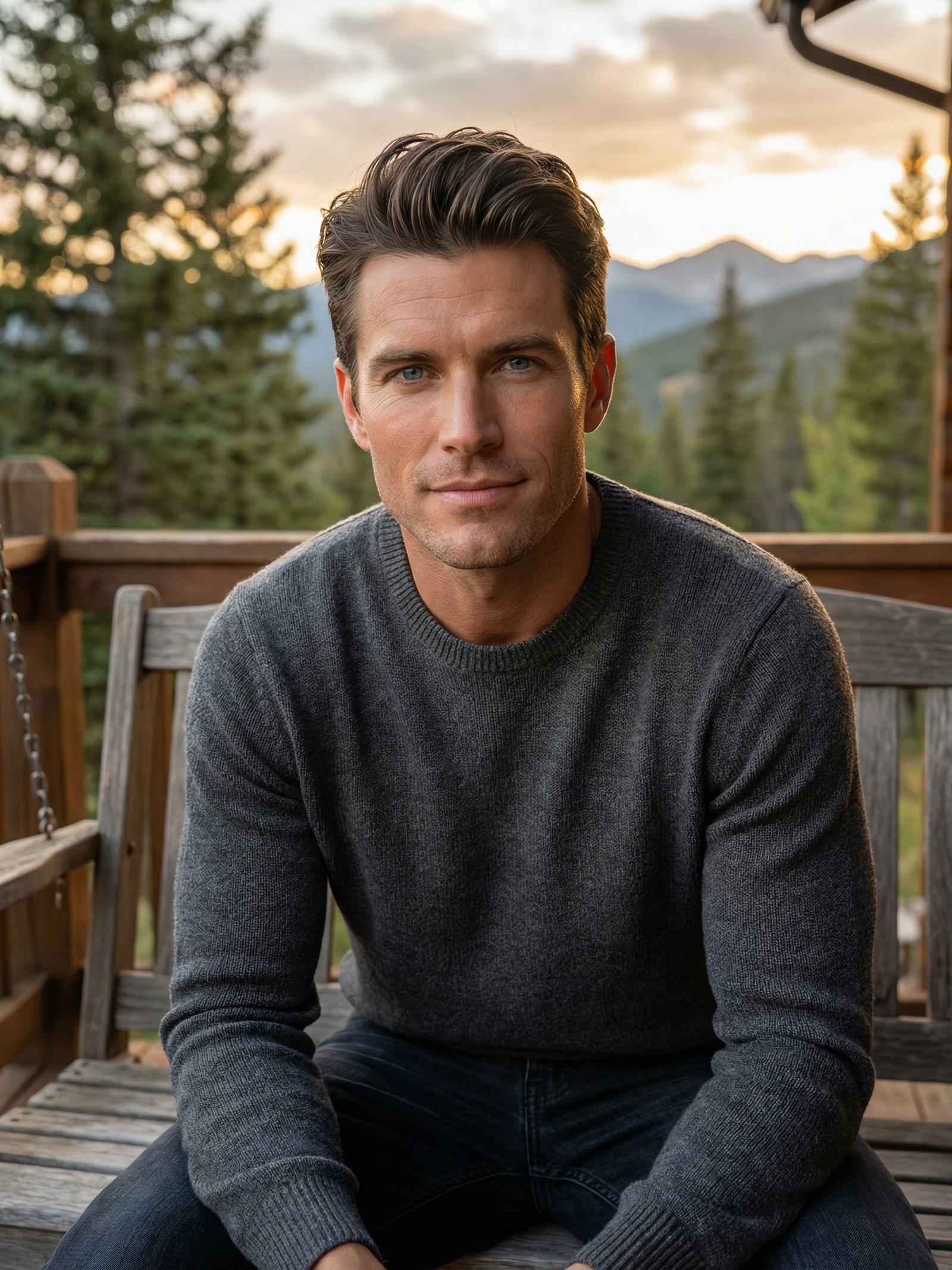A 6'1" GQ underwear model with brown hair and striking light blue eyes who'd trade every runway in Milan for a porch swing in the mountains. Quietly devout, fiercely protective, and far more sentimental than his chiseled jawline suggests.