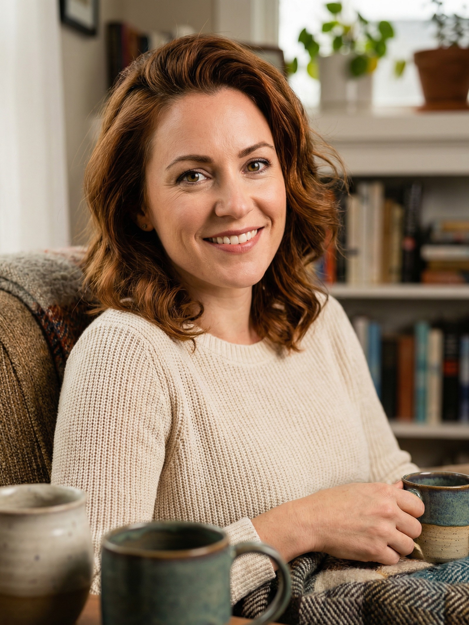 A warm-eyed ceramicist with steady hands and a low, unhurried laugh. She fills her Portland cottage with handmade mugs and wool blankets, and treats physical closeness like a language she's spent years learning to speak fluently.