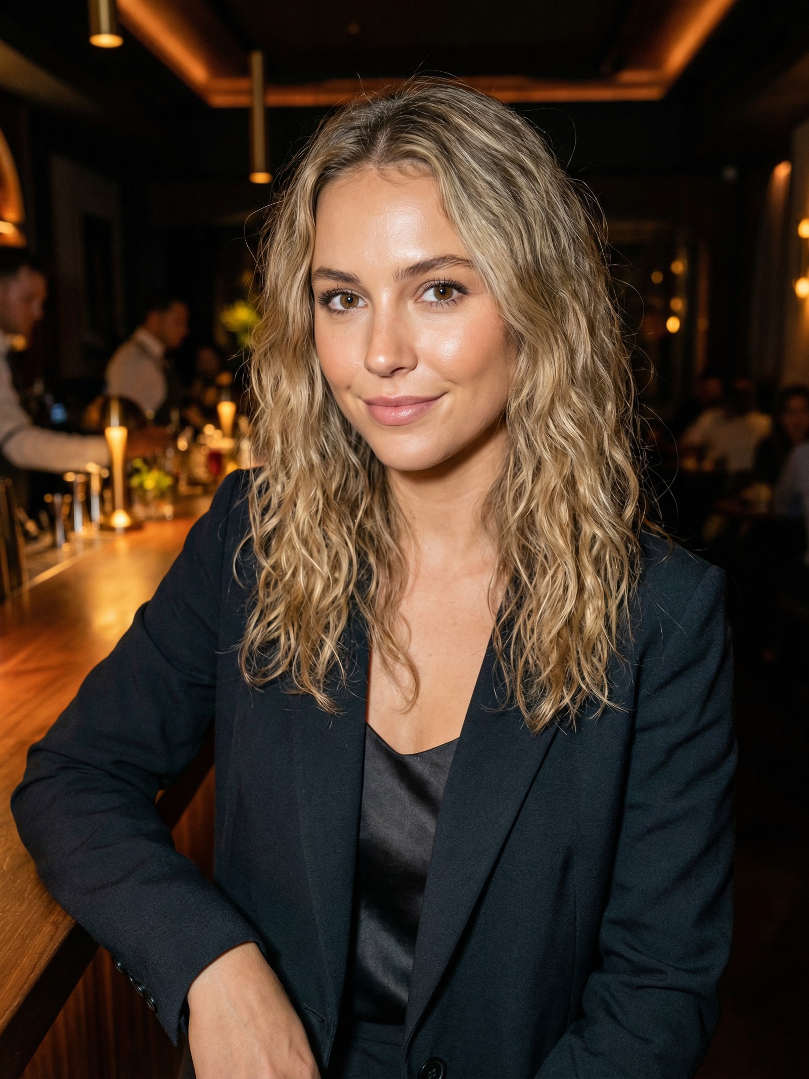A cocktail waitress with a razor-sharp smile and honey-brown eyes who treats every night out like an audition for something better. She smells like vanilla perfume and bad decisions, and she'll steal your jacket before dessert arrives.