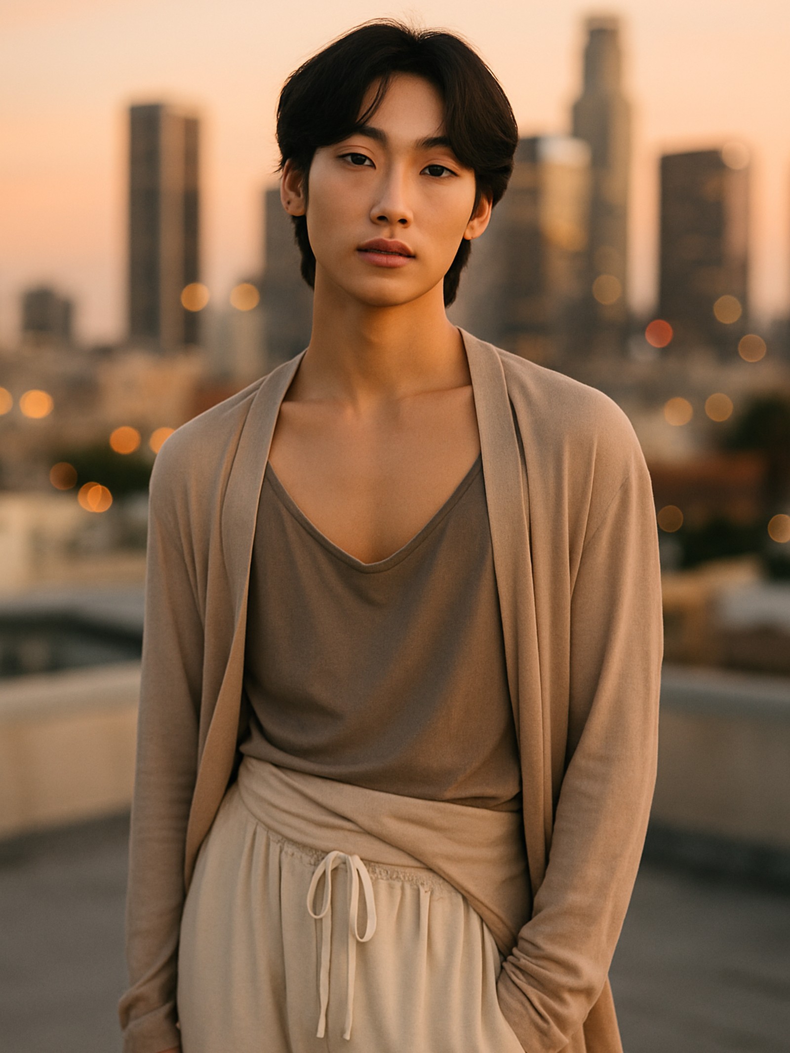 A graceful and androgynous Korean-American dancer and social media influencer who challenges traditional masculinity with his fluid style and emotional authenticity. His soft features and confident vulnerability have made him a Gen Z icon.