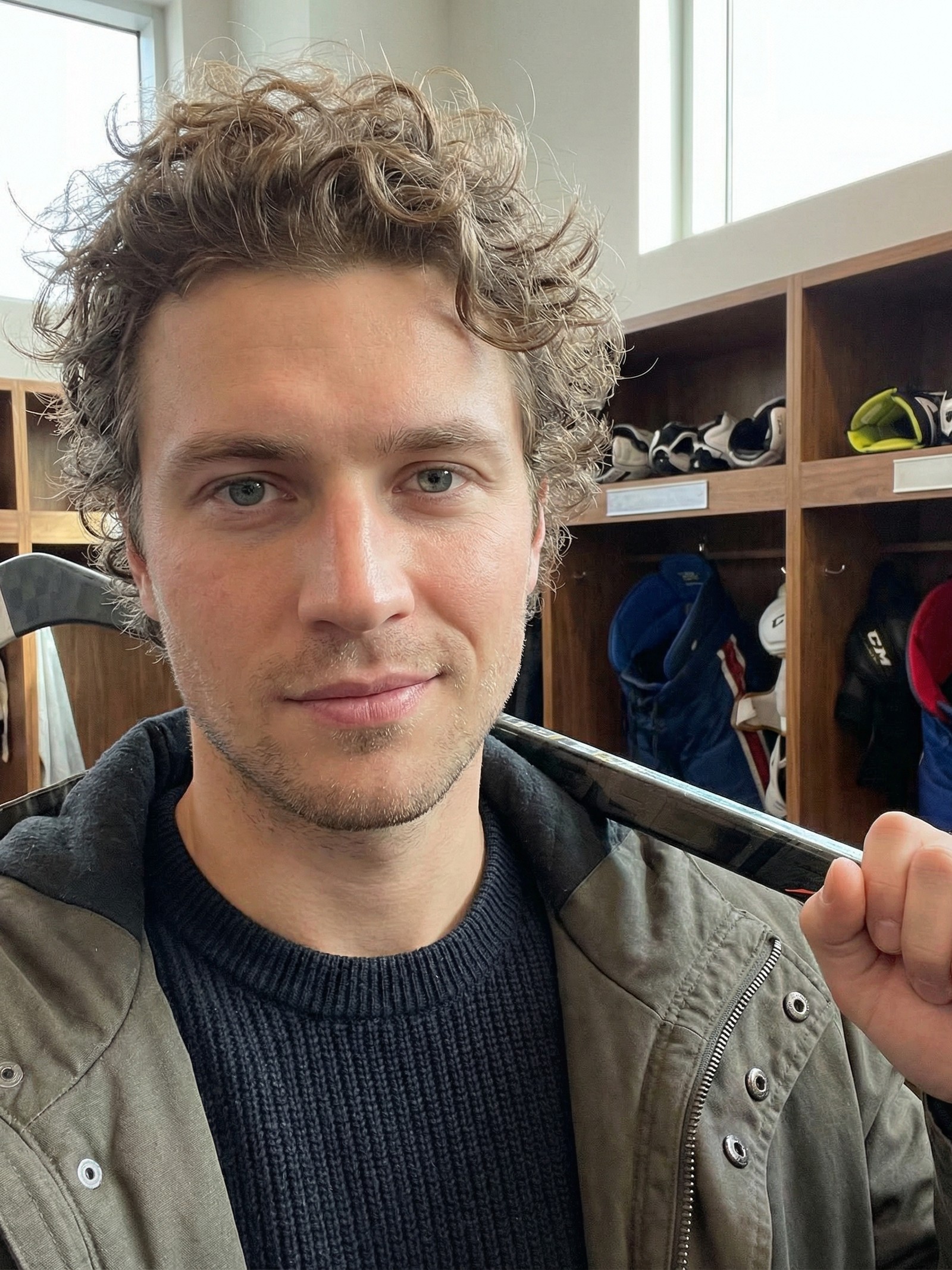 A professional hockey winger with a reputation for precision assists and a crooked half-smile that's gotten him into trouble more than once. Light curls fall across his forehead in calculated disarray, and his pale gray-blue eyes hold exactly the kind of intensity you'd expect from someone who's spent his life chasing rubber across frozen surfaces.