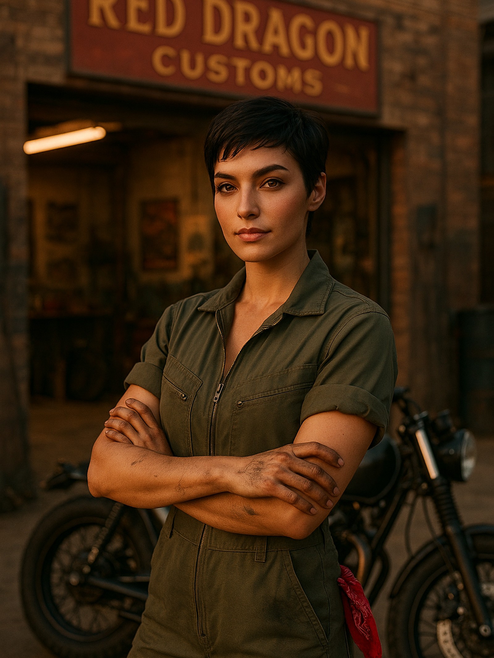 A badass motorcycle mechanic with short hair, grease under her nails, and zero tolerance for anyone who thinks she can't handle a wrench. Confident and fierce, she builds custom bikes and lives life on her own terms.